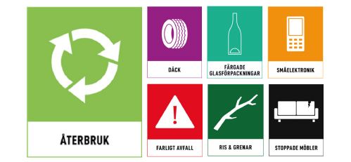 Färgade plattor med texten Återbruk, däck, färgade glasförpackningar. småelektronik, farligt avfall, ris och grenar, stoppade möbler